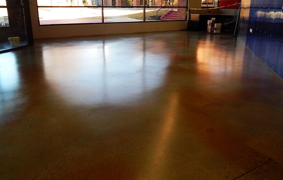1,195 sqft break room/game area remodel of business. CCPP removed adhesive, ground, patched and stained the existing floor. We applied a custom stain with five different colors in a pattern designed by the architect. Green and brown stains were mixed with a water based acrylic sealer.
